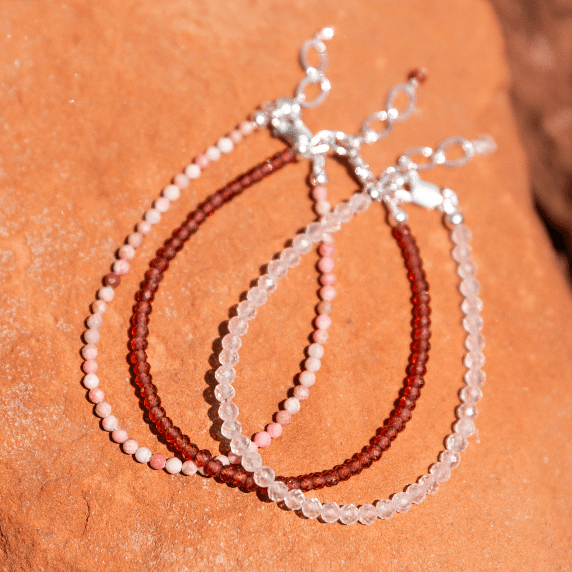 A carefully curated selection of crystals known for their connection to the heart. This bundle includes Red Garnet, Rhodonite, and Rose Quartz microbead bracelets, all of which are believed to help in the love and relationship process.